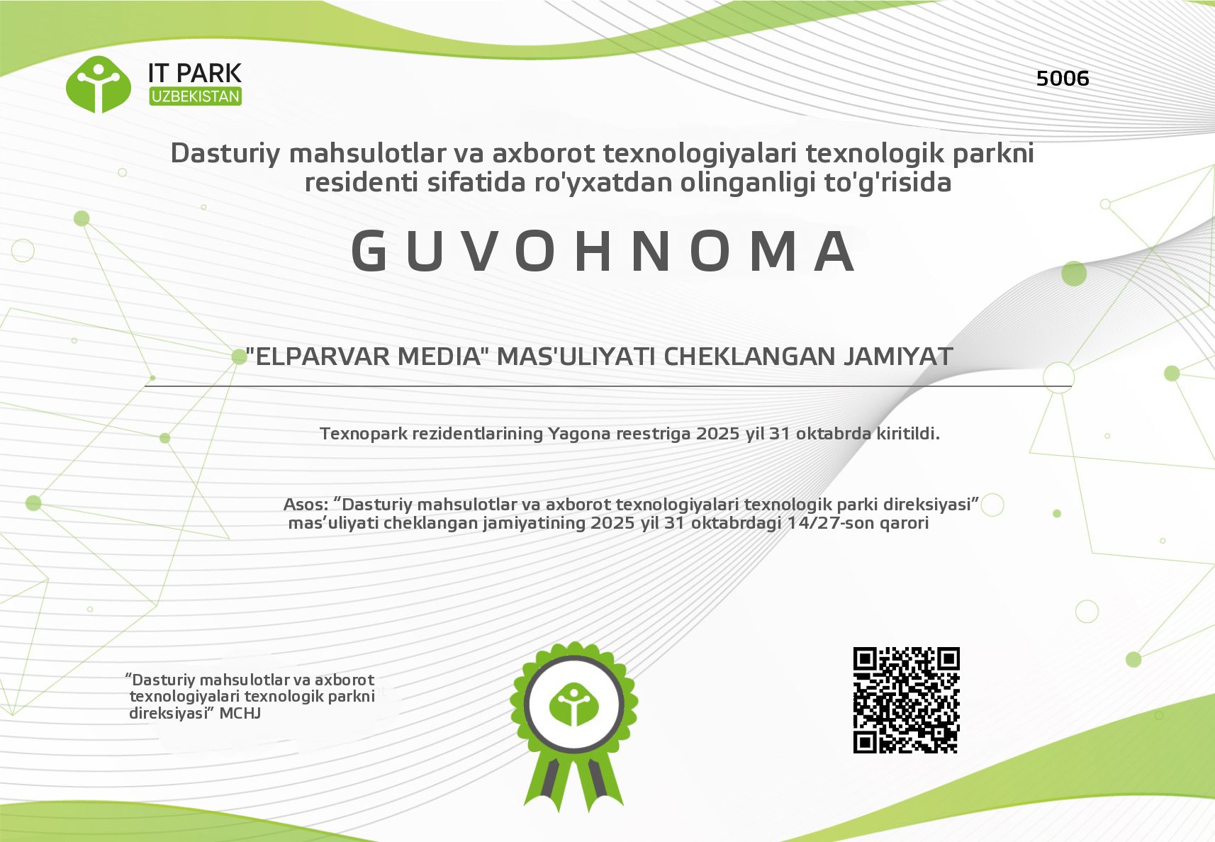 “ELPARVAR MEDIA” MCHJ Dasturiy mahsulotlar va axborot texnologiyalari texnologik parki (IT Park Uzbekistan) rezidenti sifatida ro‘yxatdan o‘tgan. Guvohnoma ma’lumotlari: