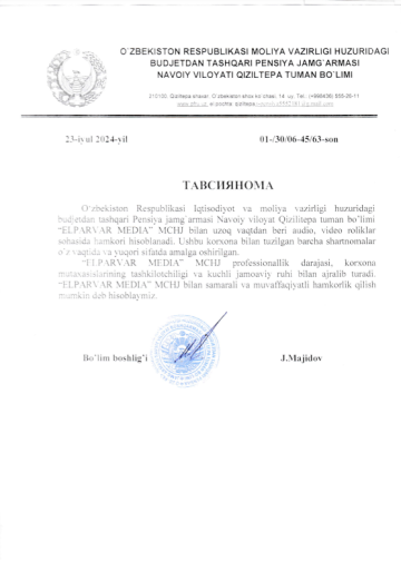 Byudjetdan tashqari Pensiya jamg‘armasining Navoiy viloyati Qiziltepa tuman bo‘limi “ELPARVAR MEDIA” MCHJni audio va video roliklar sohasida ishonchli hamkor sifatida tan olgan. Tavsiyanomada korxona jamg‘arma tashabbuslari, pensiya tizimi bo‘yicha yangiliklar va ijtimoiy loyihalarni jamoatchilikka aniq, tushunarli va qiziqarli shaklda yetkazishda muhim rol o‘ynagani qayd etiladi.