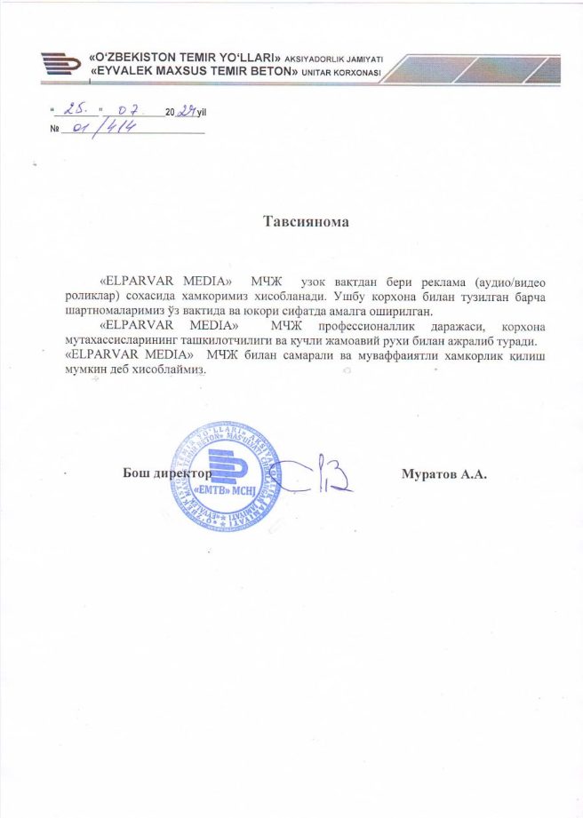 “ELPARVAR MEDIA” MCHJ “O‘zbekiston temir yo‘llari” aksiyadorlik jamiyati tarkibidagi “Evylek maxsus temir beton buyumlari zavodi” uchun reklama (audio va video roliklar) tayyorlash yo‘nalishida doimiy hamkor sifatida faoliyat yuritib keladi. Tavsiyanomada zavod infratuzilmasi, mahsulotlari va xizmatlarini yorituvchi vizual kontent yuksak sifatda, zamonaviy media standartlariga mos ravishda ishlab chiqilgani ta’kidlanadi.