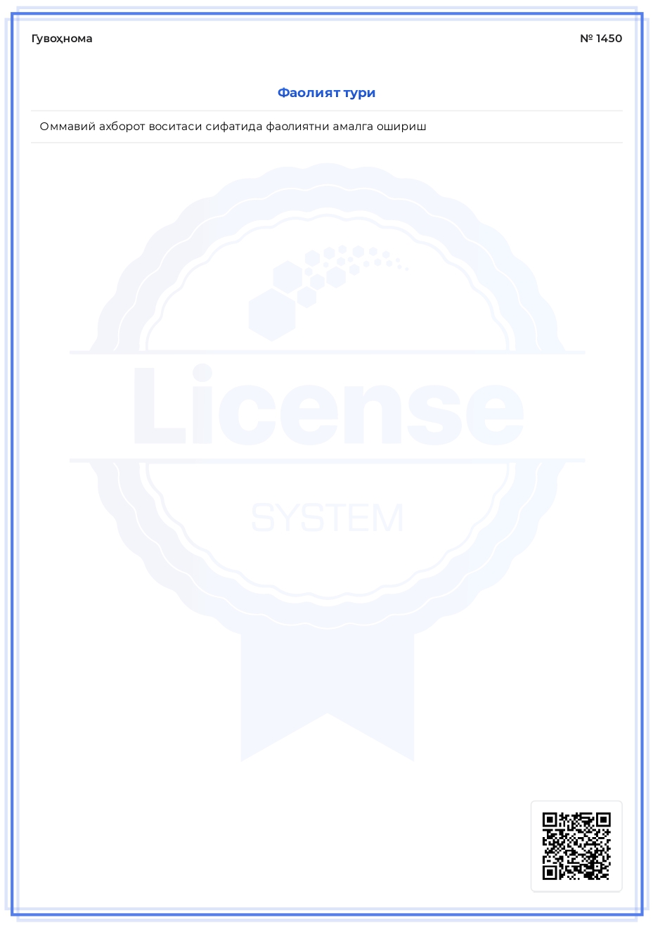 - Litsenziya reestri bo‘yicha tartib raqami: 1450