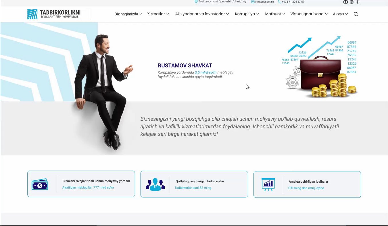 Kompaniyaning investitsion loyihalari, kredit va qo‘llab-quvvatlash dasturlarini yorituvchi korporativ darajadagi veb-sayt ishlab chiqildi. Sayt ham mahalliy tadbirkorlar, ham xorijiy hamkorlar uchun ma’lumot markazi vazifasini bajaradi.Biz bajargan ishlar: